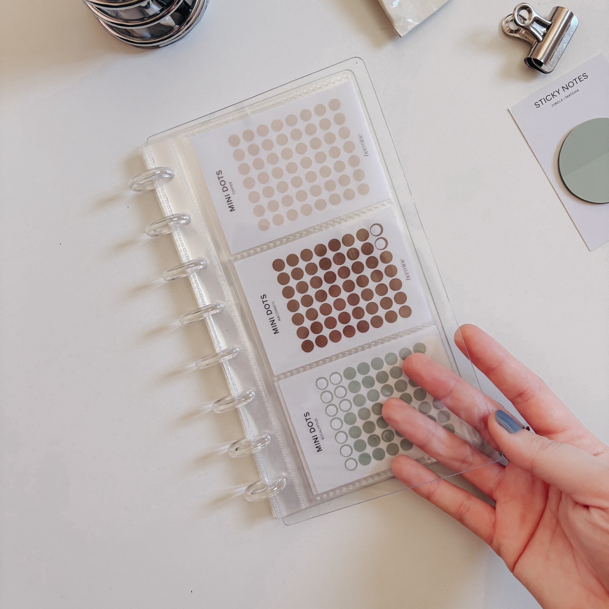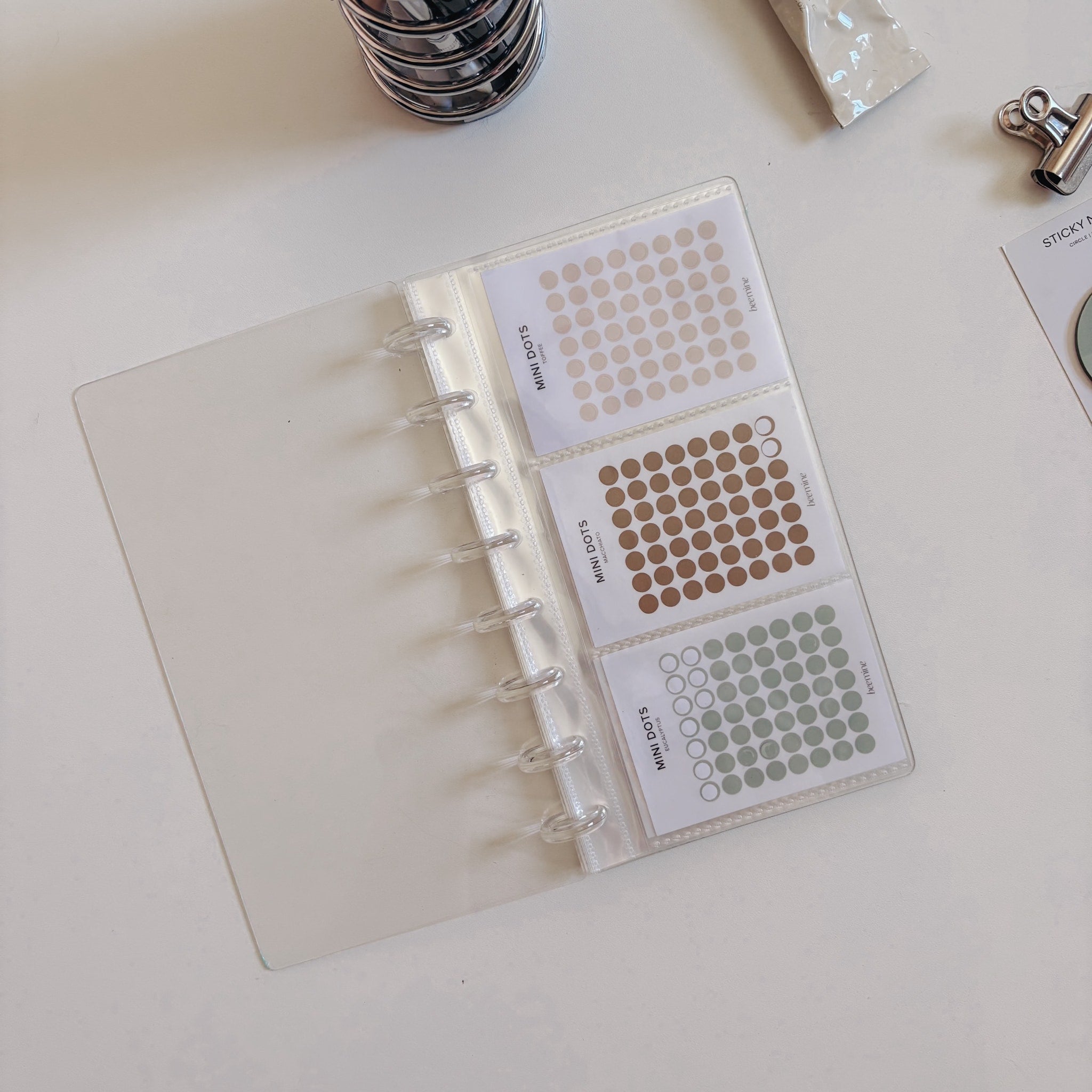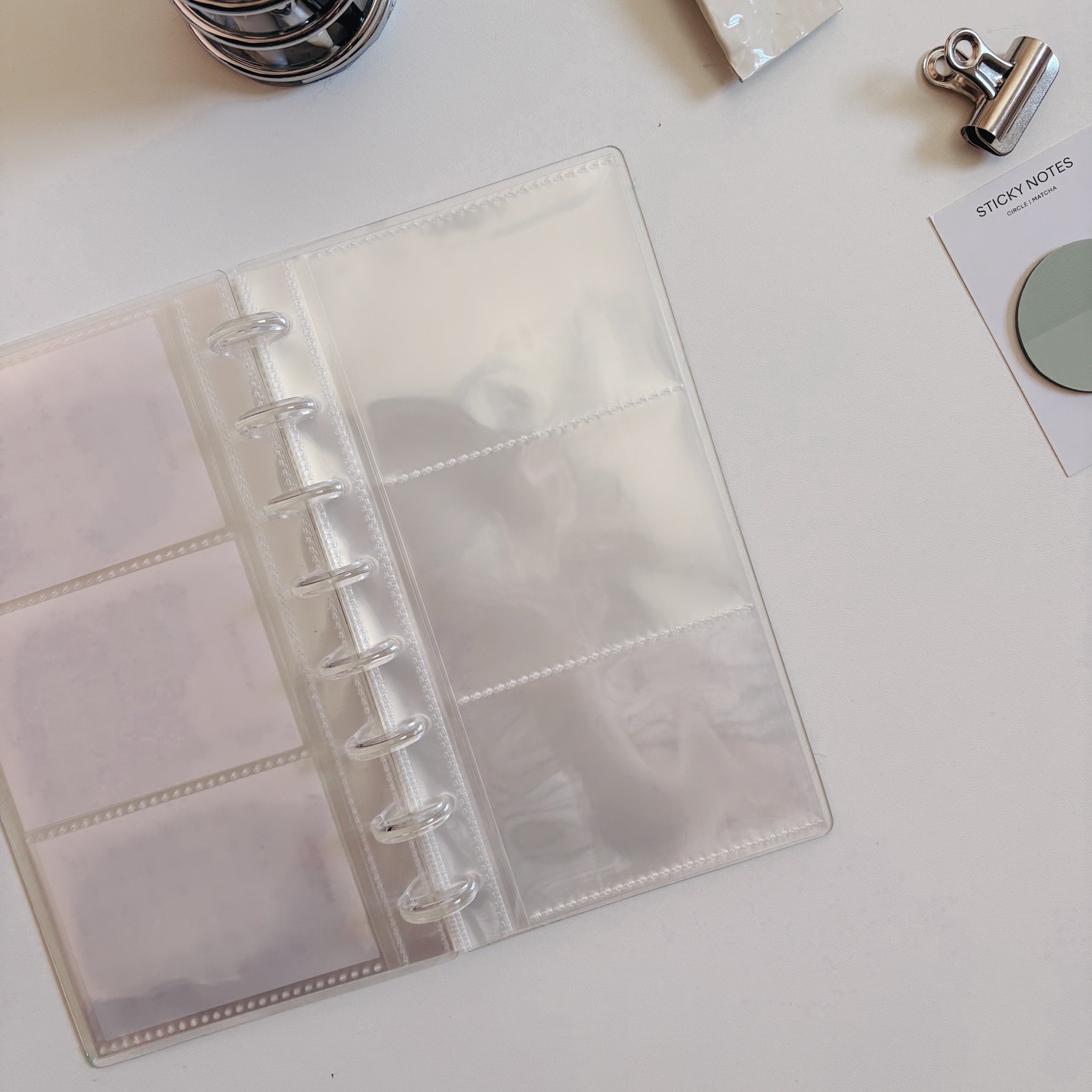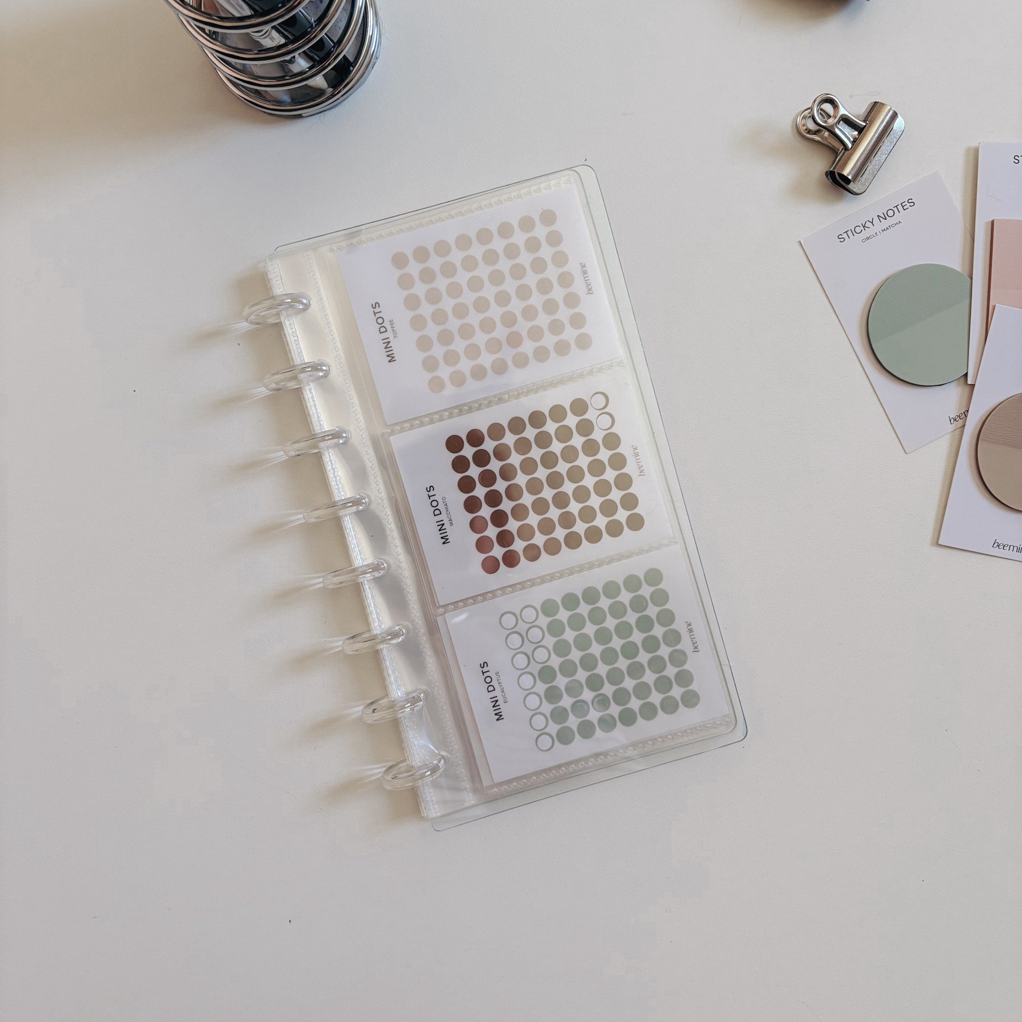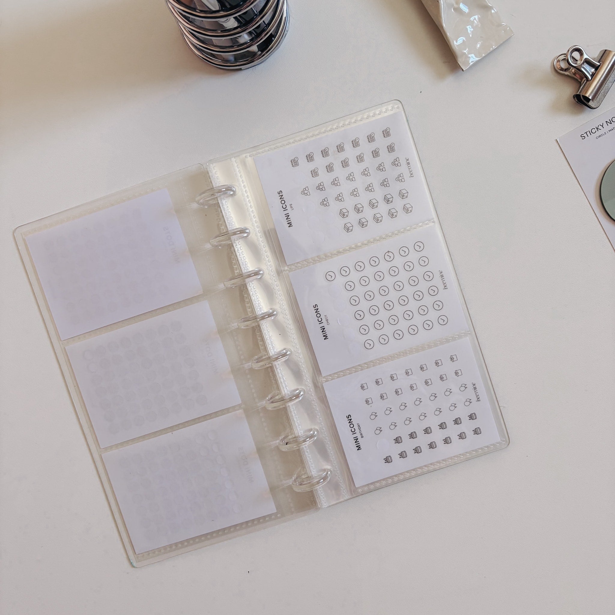 Com ele, você pode organizar sua coleção de mini adesivos da Bee, guardar sticky notes, photocards ou até mesmo criar um álbum de memórias com fotos tamanho instax mini.