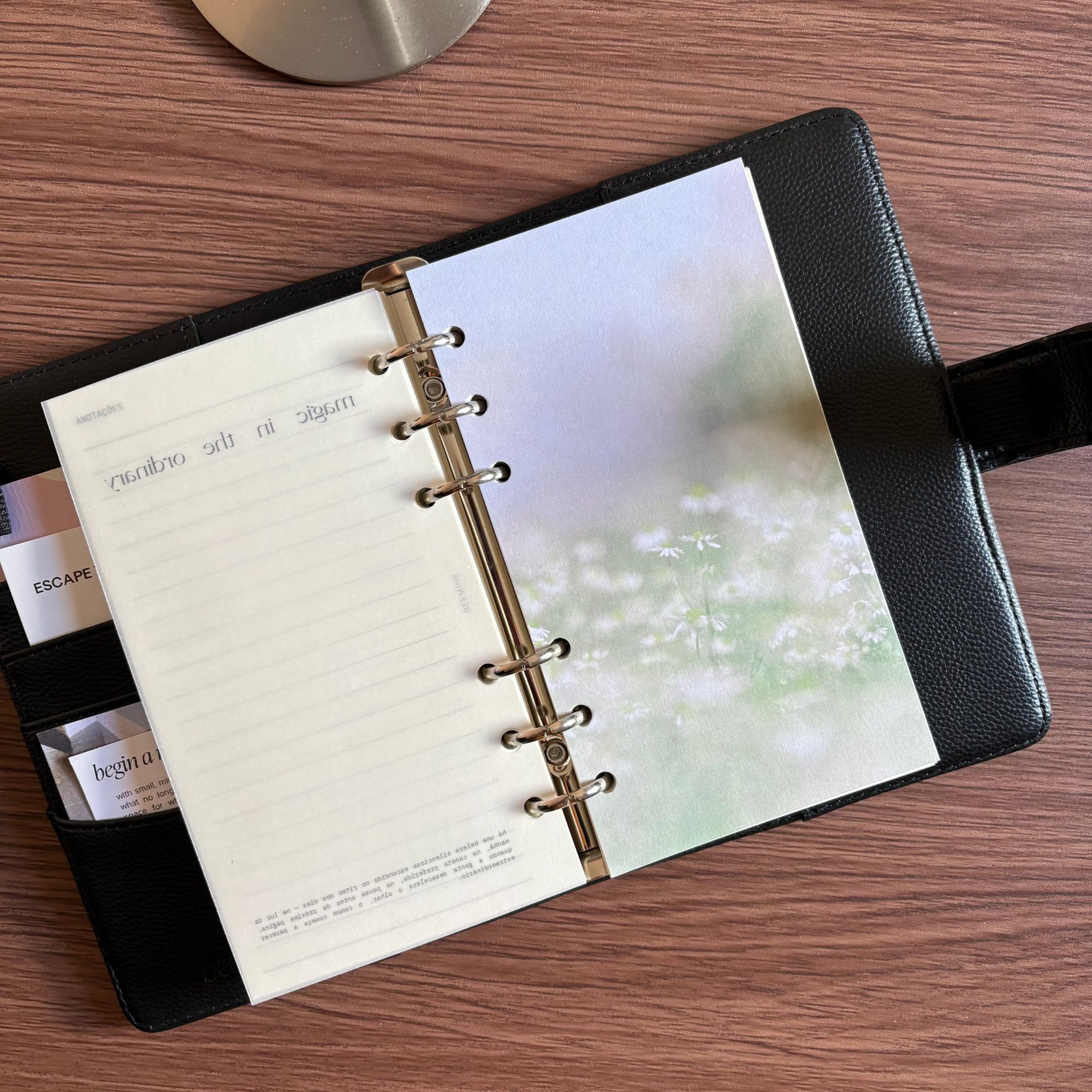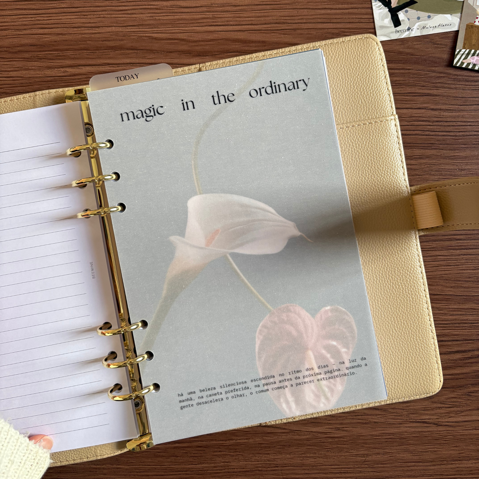 Uma folha em papel vegetal, traz a frase “magic in the ordinary”, um lembrete suave de que até os dias comuns podem ser extraordinários.