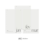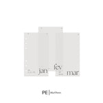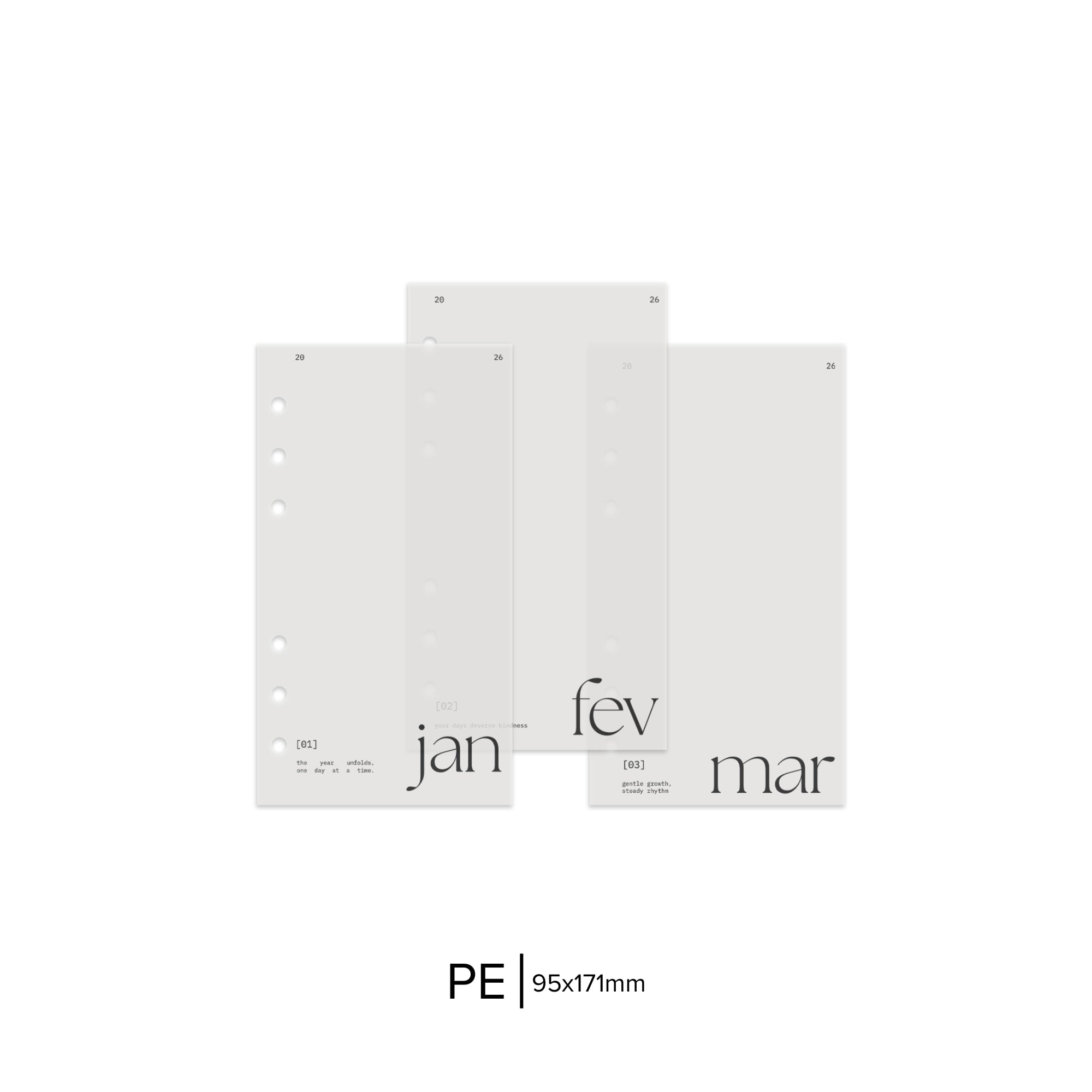 Cada mês conta com em um design clean e minimalista, impresso em papel translúcido vellum, criando pequenas pausas visuais que trazem textura, leveza e intenção ao seu planejamento.