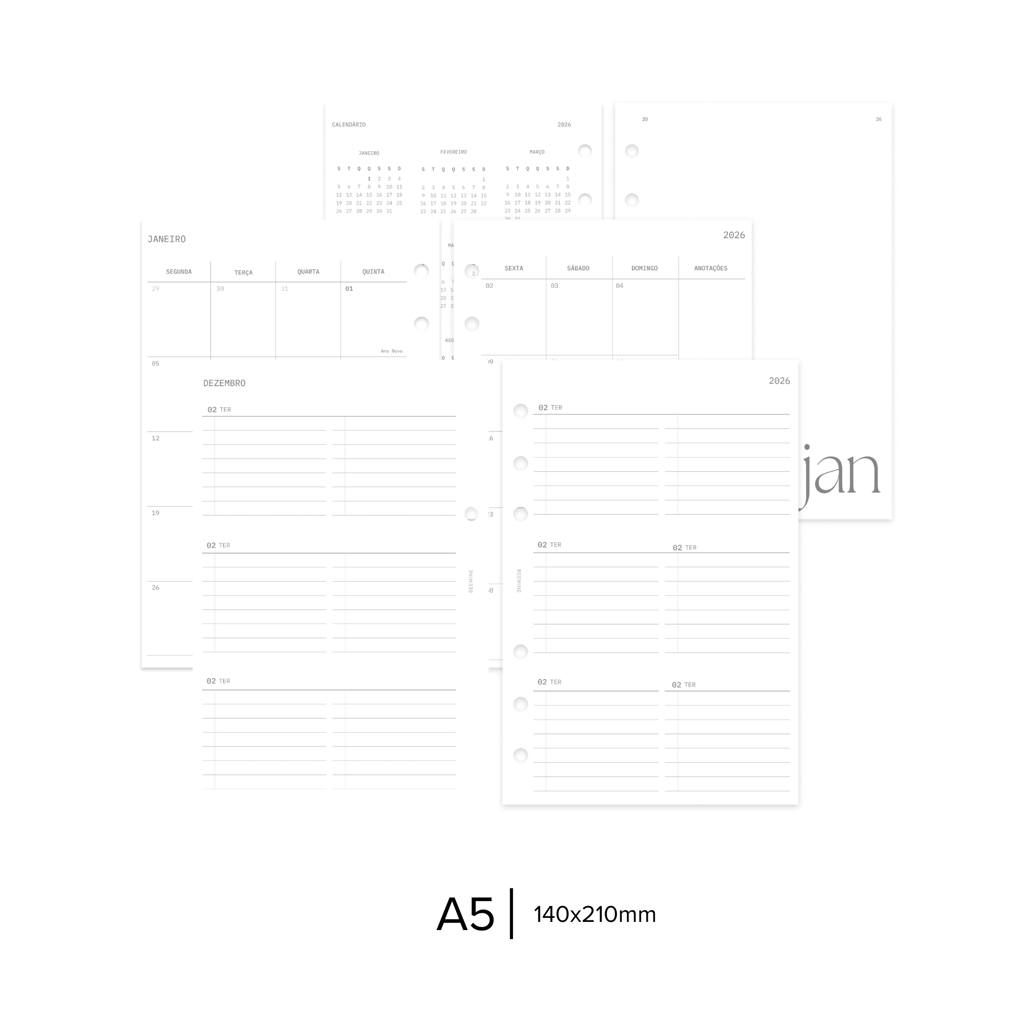 O refil datado 2026 foi criado pra te acompanhar ao longo do ano com leveza. Uma ferramenta minimalista que te ajuda a focar no que realmente importa, sem sobrecarregar a rotina.